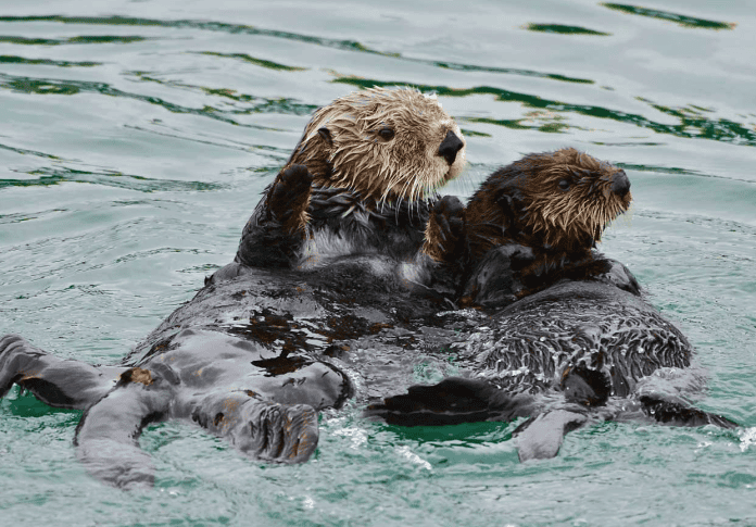 Typically, a mother otter cares for her baby for up to several months, often carrying it on her chest.